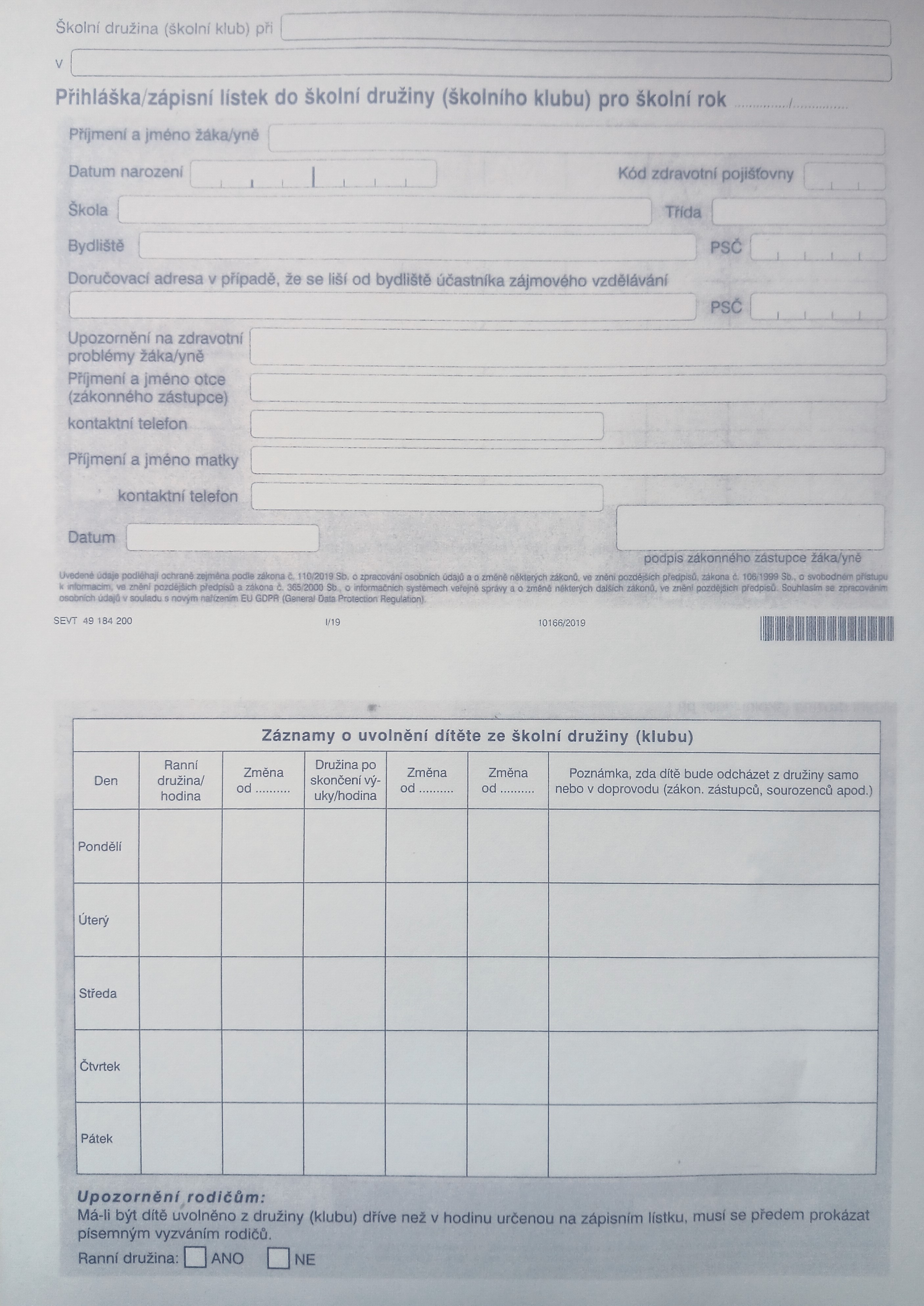 - Družina po skončení výuky/hodina: ANO x NE a čas odchodu (viz provoz školní družiny)