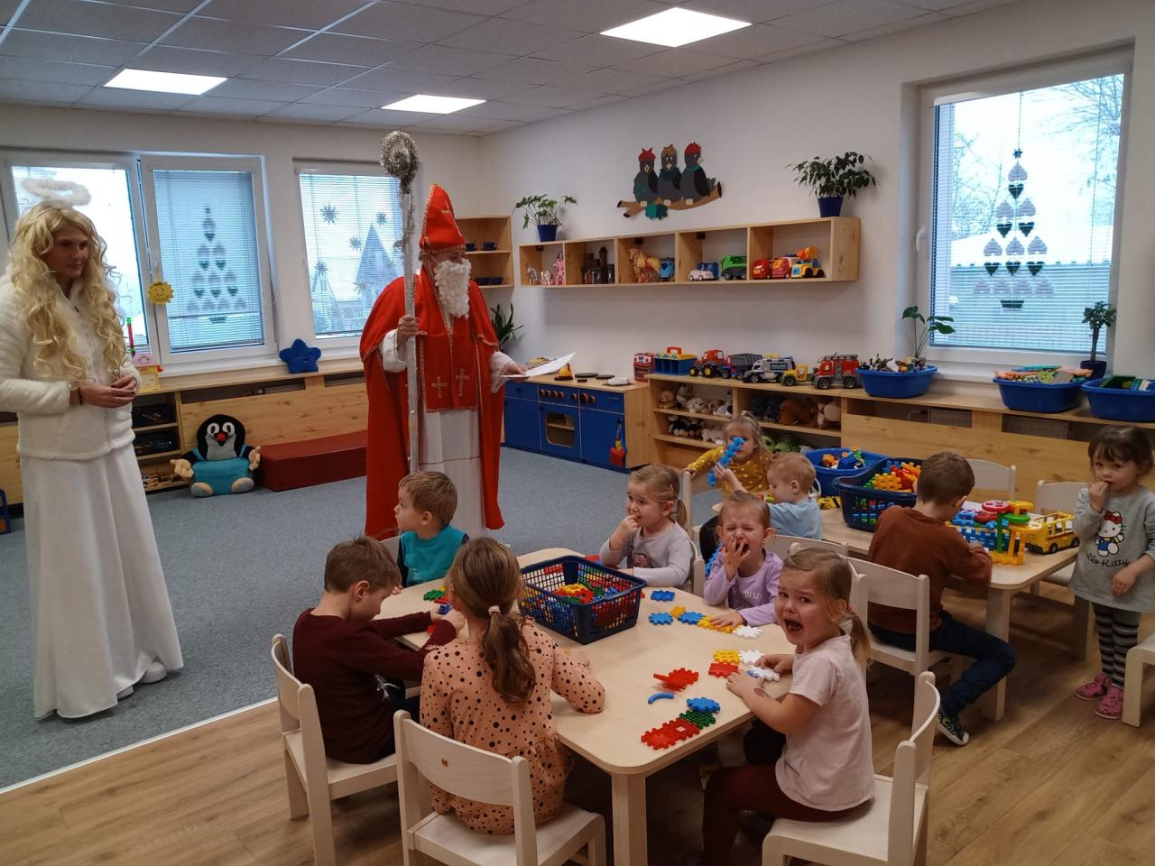 Navštívil nás Mikuláš a andělem a čertem. Děti se pochlubily v čem jsou šikovné, co je baví a čertík nás malinko postrašil. Děti dostaly balíčky dobrot.