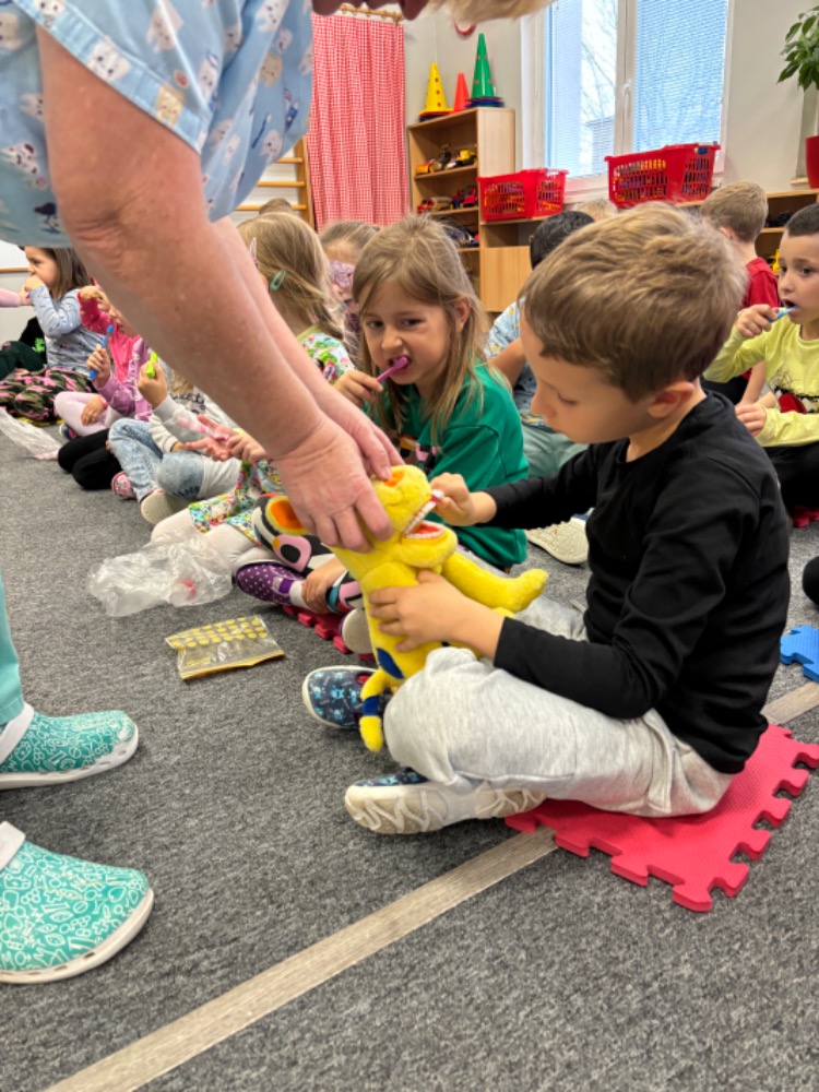 Následně paní hygienistky, které se specializují na zubní hygienu, ukázaly dětem správnou techniku čištění zubů pomocí praktických ukázek a pomůcek. Děti měly možnost si samy vyzkoušet, jak správně používat zubní kartáček, což byl pro ně velmi zábavný a poučný zážitek.