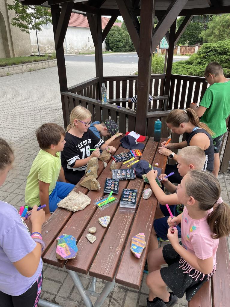 Tábor odstartoval v pondělí zlehka, ale s velkou dávkou kreativity. Děti se vydaly na procházku na hřiště do nedalekých Želechovic. Cestou "lovily" kamínky, které se po příchodu na hřiště za pomoci barev a dětské fantazie proměnily v krásné upomínkové předměty. První den tak byl ve znamení klidného naladění a vytvoření prvních společných vzpomínek.