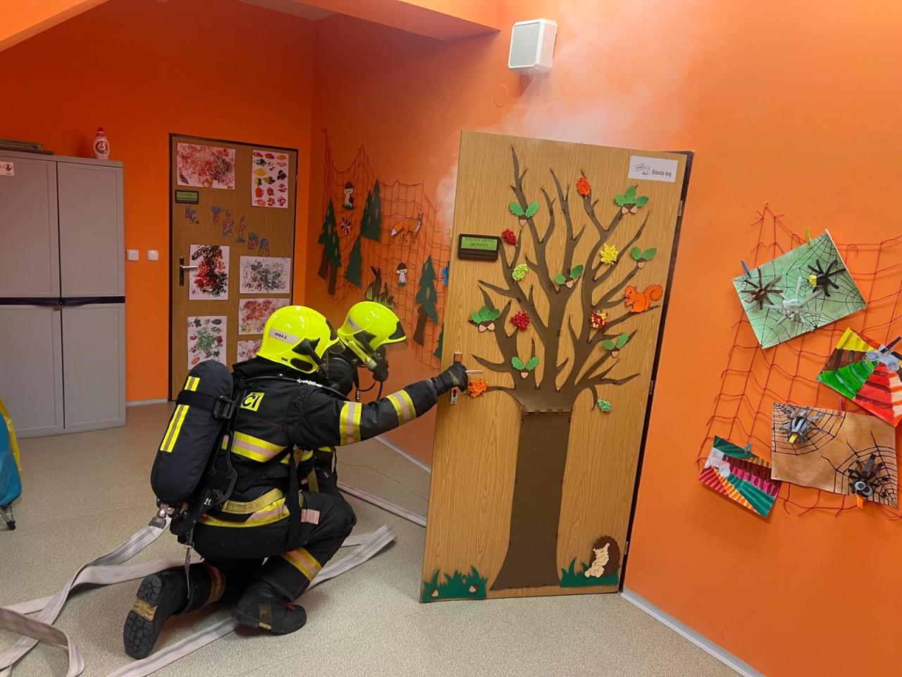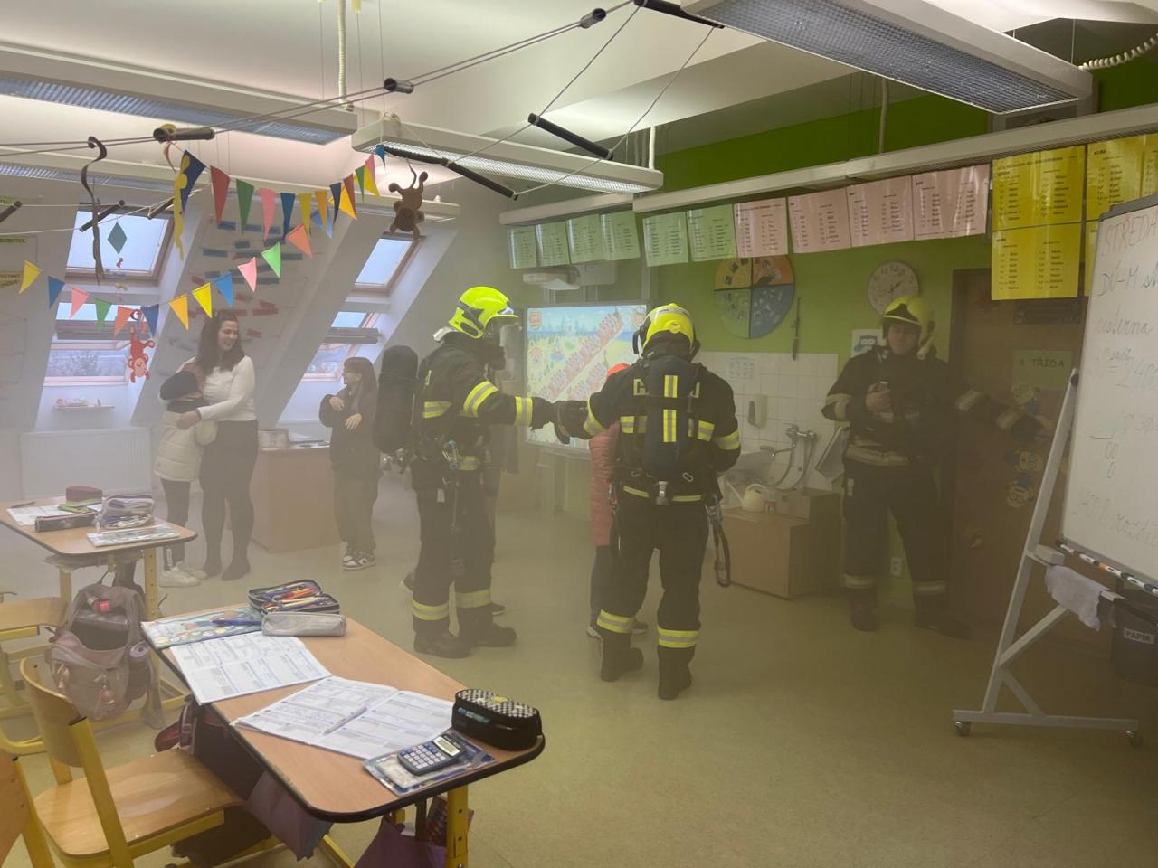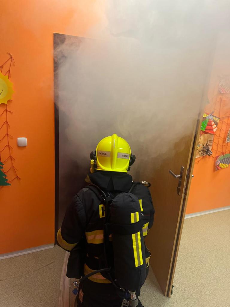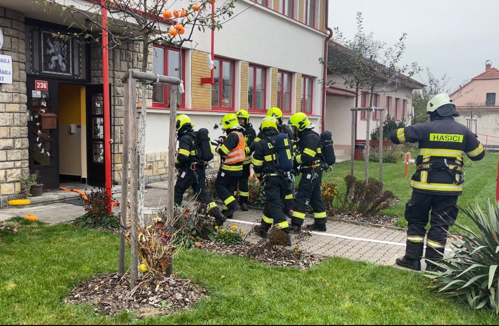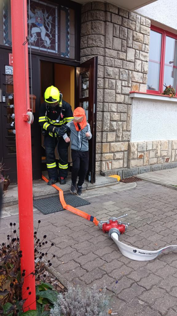 Proto jsme dne 6.11. uskutečnili nácvik evakuace žáků v případě požáru. V 9:15, po zavolání na linku 150, se rozezněly sirény. Učitelé zorganizovali žáky a upozornili je na nutné opuštění budovy únikovým východem. Za nedlouho se před školu sjely čtyři hasičské jednotky. Po shromáždění proběhla kontrola počtů a bylo zjištěno, že „někdo chybí“. Začala simulace záchrany žáků a učitelky, kteří z důvodu požáru keramické dílny nemohli opustit učebnu. Všichni byli postupně hasiči vyvedeni ve vyváděcích maskách hlavních vchodem. Po ukončení nácviku proběhla reflexe celé akce samotnými hasiči.