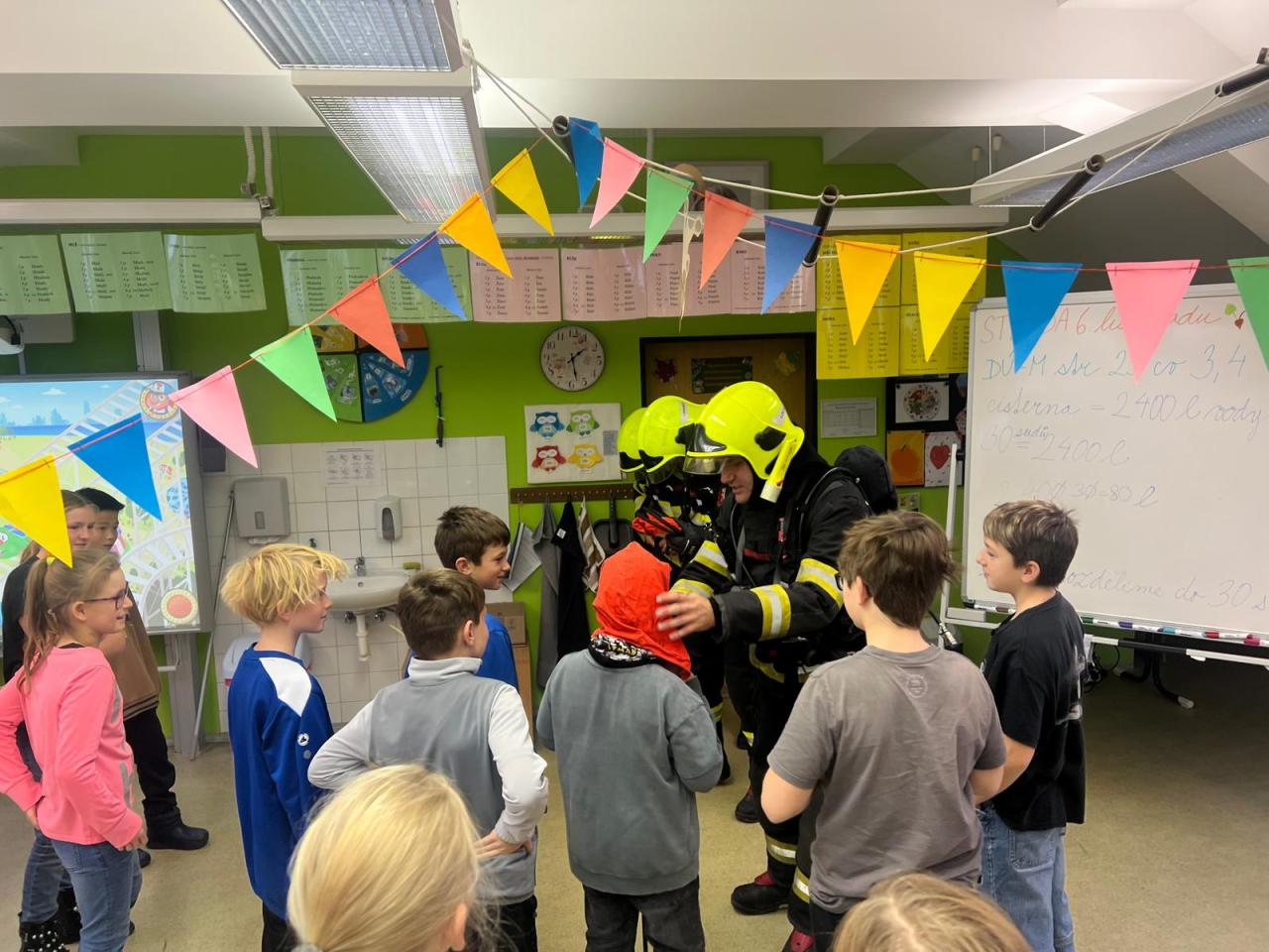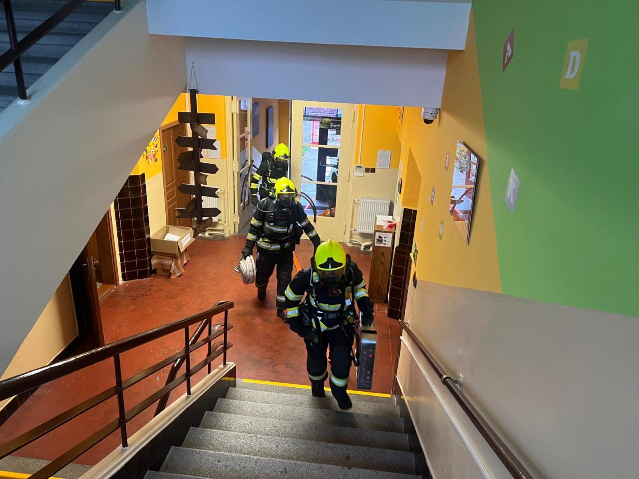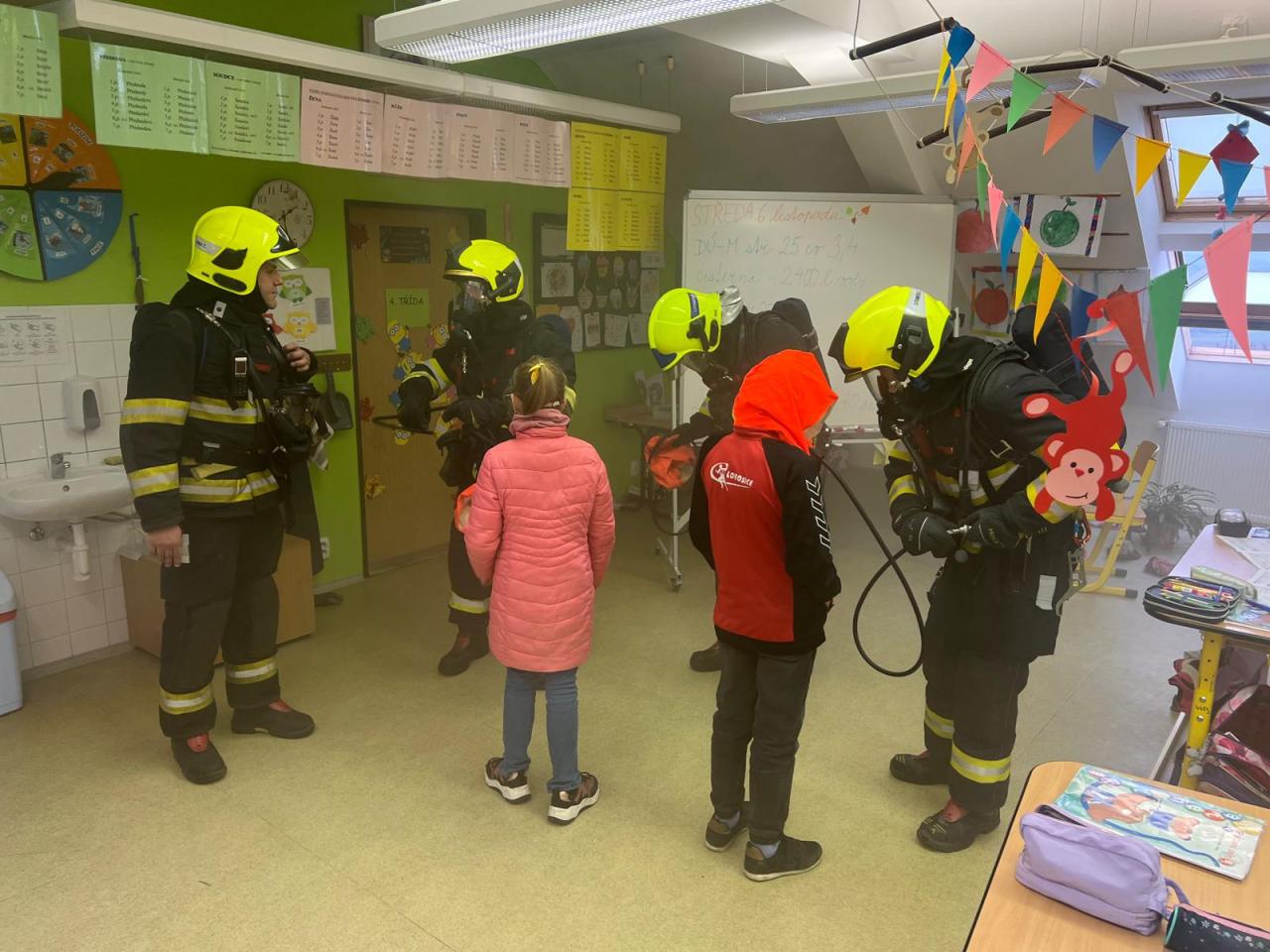 Proto jsme dne 6.11. uskutečnili nácvik evakuace žáků v případě požáru. V 9:15, po zavolání na linku 150, se rozezněly sirény. Učitelé zorganizovali žáky a upozornili je na nutné opuštění budovy únikovým východem. Za nedlouho se před školu sjely čtyři hasičské jednotky. Po shromáždění proběhla kontrola počtů a bylo zjištěno, že „někdo chybí“. Začala simulace záchrany žáků a učitelky, kteří z důvodu požáru keramické dílny nemohli opustit učebnu. Všichni byli postupně hasiči vyvedeni ve vyváděcích maskách hlavních vchodem. Po ukončení nácviku proběhla reflexe celé akce samotnými hasiči.