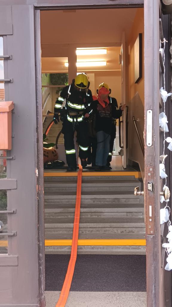 Proto jsme dne 6.11. uskutečnili nácvik evakuace žáků v případě požáru. V 9:15, po zavolání na linku 150, se rozezněly sirény. Učitelé zorganizovali žáky a upozornili je na nutné opuštění budovy únikovým východem. Za nedlouho se před školu sjely čtyři hasičské jednotky. Po shromáždění proběhla kontrola počtů a bylo zjištěno, že „někdo chybí“. Začala simulace záchrany žáků a učitelky, kteří z důvodu požáru keramické dílny nemohli opustit učebnu. Všichni byli postupně hasiči vyvedeni ve vyváděcích maskách hlavních vchodem. Po ukončení nácviku proběhla reflexe celé akce samotnými hasiči.
