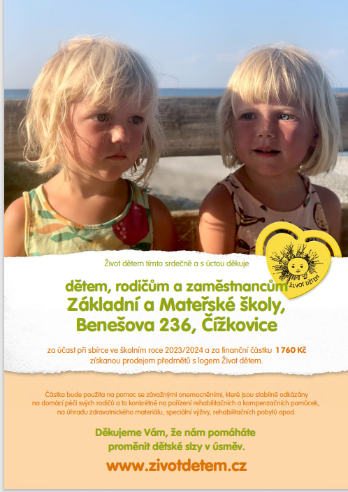 Děkovný certifikát k účasti ve sbírce Život dětem