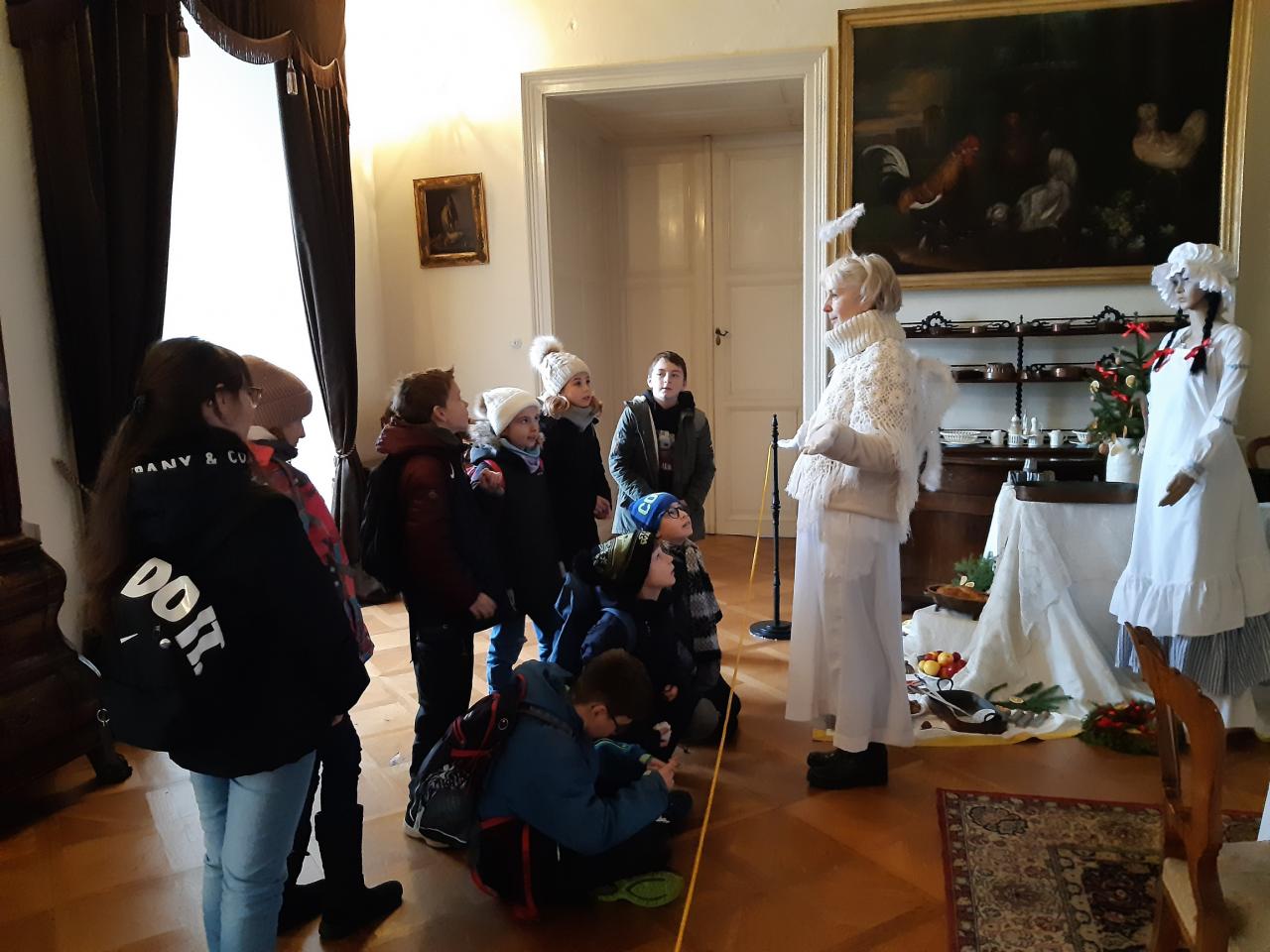 Začátek adventu se žáci 4. a 5. třídy rozhodli prožít tradičně a to vánoční prohlídkou historického interiéru zámku Libochovice. Zde se dozvěděli odkud k nám přišel vánoční stromeček, co se nejčastěji jedlo ke štědrovečerní večeři, jaké zvyky a tradice jsou spojeny s Vánocemi, poznali svatou Barboru, svatou Lucii a svatého Mikuláše. Zkusili si předpovědět i budoucnost. Zjistili, že ve sklepě zámku v zámecké kuchyni spí opravdový čert. Součástí prohlídky byla minidílna, kde si vyrobili zápich vlastnoručně vyrobeného stromečku. Edukační program skutečně dostál svému názvu, byl velmi poutavý a zážitkový. Děkujeme našemu anděli průvodci, který pro nás byl velkou studnicí informací k adventnímu období.