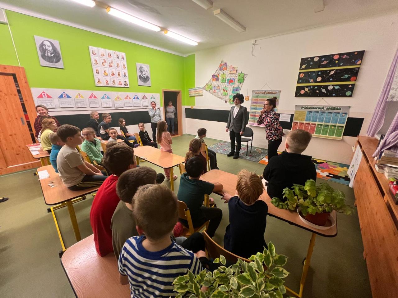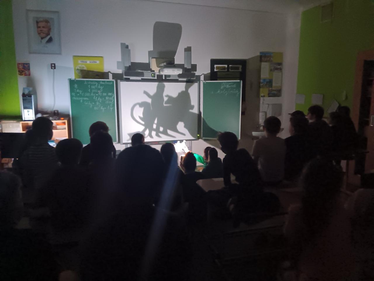 Když jsme shlédli představení, připravili jsme se na velmi oblíbenou "baterkovanou". Školní prostředí ve tmě je opravdu jiné, než jak ho známe. Žáci procházeli školou a s pomocí baterek hledali ukrytá slova, která vhodně vkládali do textu o spisovateli.