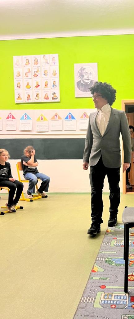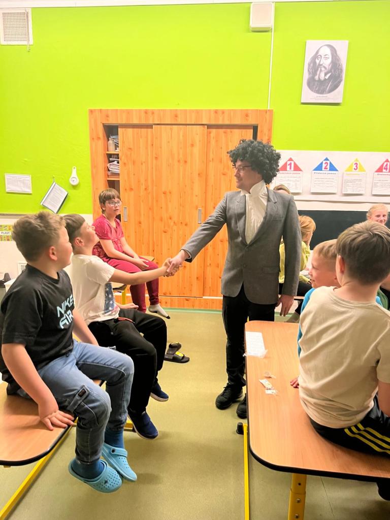 V budově jsme se přesunuli do "divadla" - třídy připravené na divadelní představení stínové pohádky Sněhová královna. Než ale představení začalo, chtěli jsme všem blíže představit proslulého spisovatele H. CH. Andersena, na jehož počest se večer koná. A aby bylo představení pro žáky co nejvíce poutavé, pozvali jsme "samotného spisovatele" na návštěvu. Společný rozhovor byl nejen plný informací, ale hlavně zábavy :-)