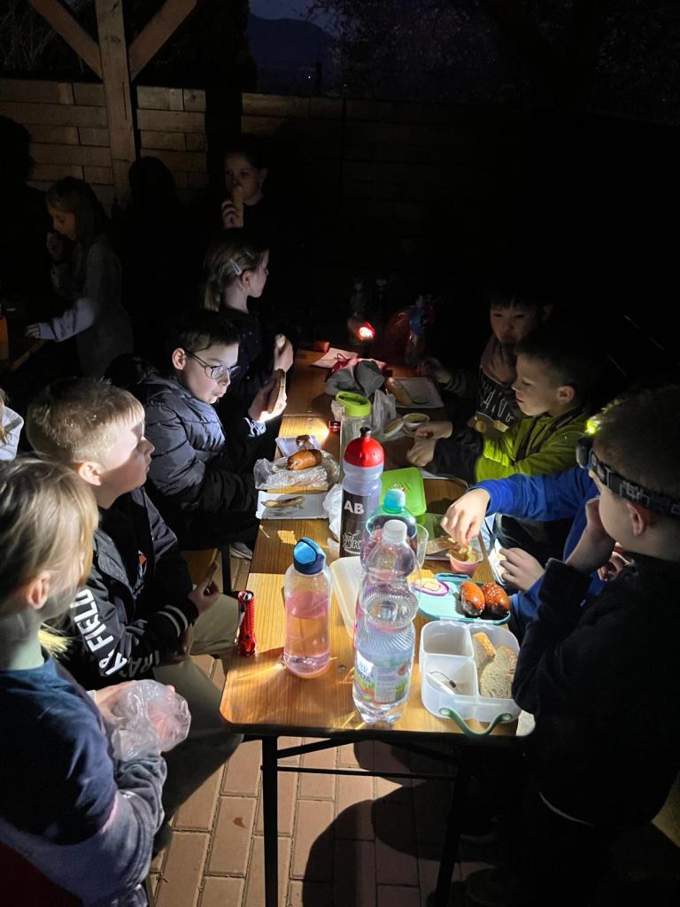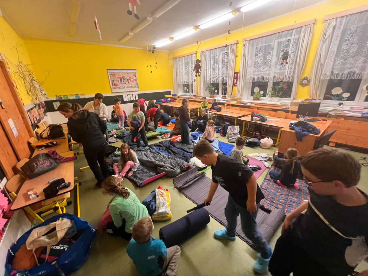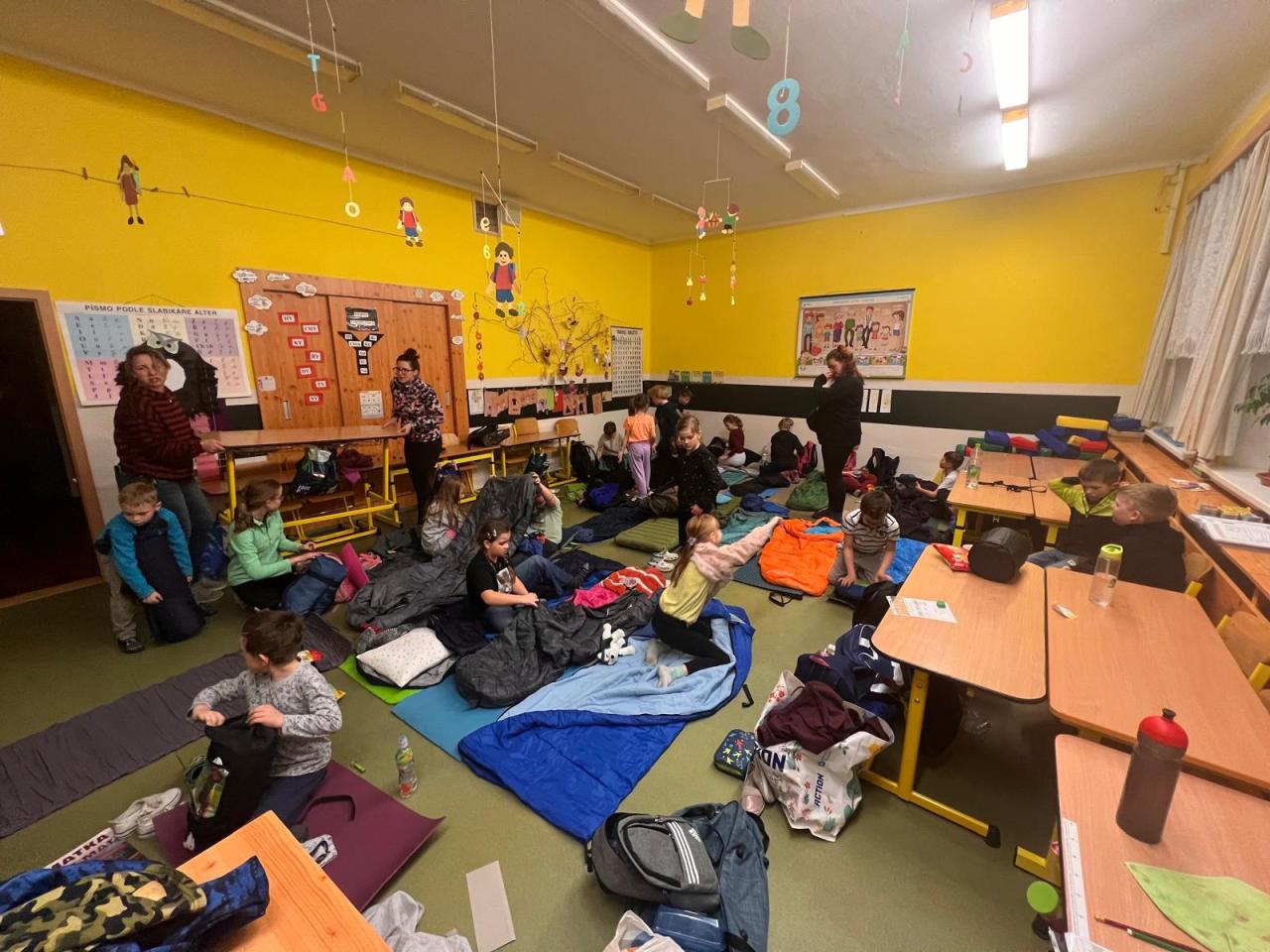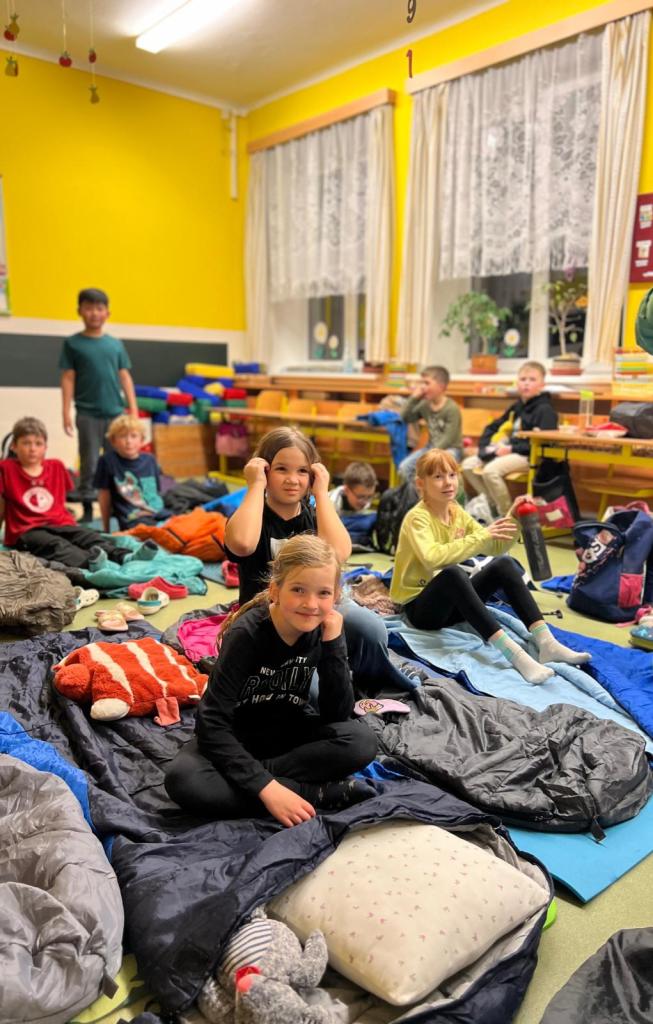 V závěru samotného večera si žáci připravili spacáky, bulánky, plyšáky, občerstvení a netrpělivě čekali na slíbené kino. U něho všichni, ať už dříve nebo později, v klidu a unavení usnuli.