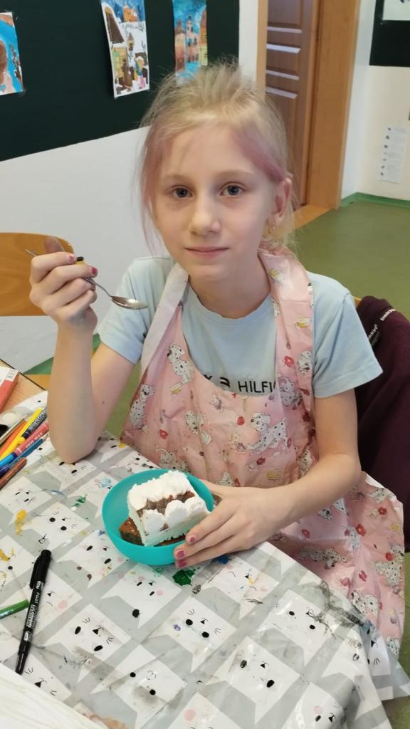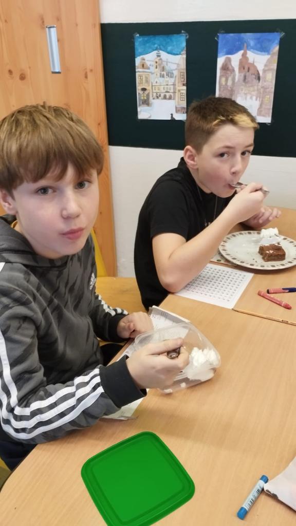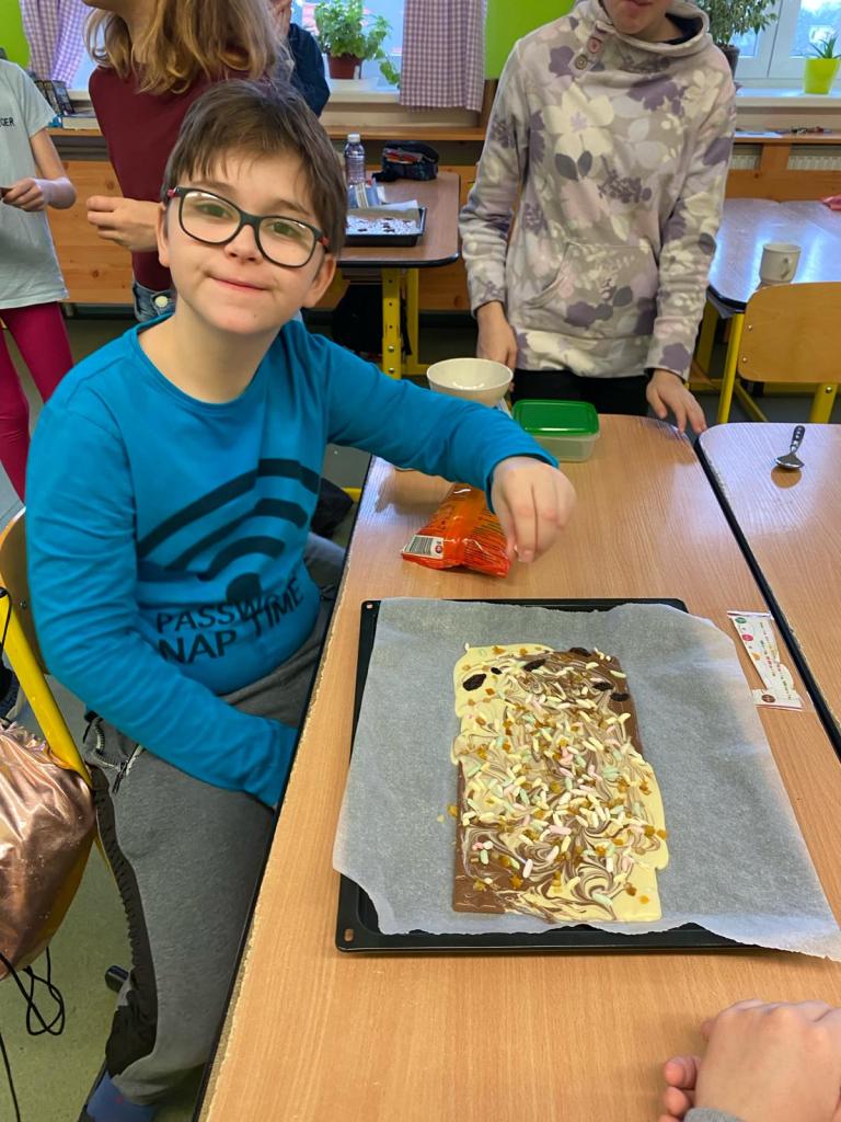 Dne 9. 2. 2024 žáci 4.a 5. třídy v projektovém dni s názvem Trochu moc čokolády je vždy tak akorát prožili den provoněný vůní čokolády. V úvodu se ve SMART prezentaci seznámili s výrobou čokolády, poznali místa, odkud k nám tato pochoutka přichází. V praktické části si smíchali těsto na jablko-čokoládovou buchtu a kreativně si ozdobili rozpuštěnou čokoládu. Než se sladké tvořeníčko upeklo, zasportovali si v tělocvičně. V praktické části dne popustili uzdu své fantazii a nakreslili svou „Továrnu na čokoládu“. V závěru dne se všichni těšili na ochutnávku buchty se zmrzlinovým pohárem. Mňam, to byla dobrůtka! 😊